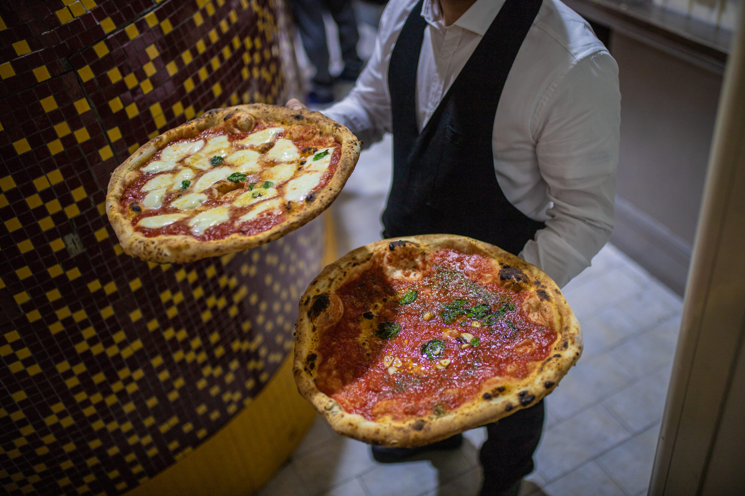 A server presents two pizzas, one Margherita and one Marinara, beside a yellow-brown tiled wall in Naples’ famous pizzeria.