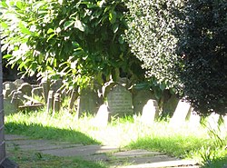 Several weathered gravestones sit closely together beneath leafy trees in a quiet London cemetery, with sunlight dappling the lush grass.
