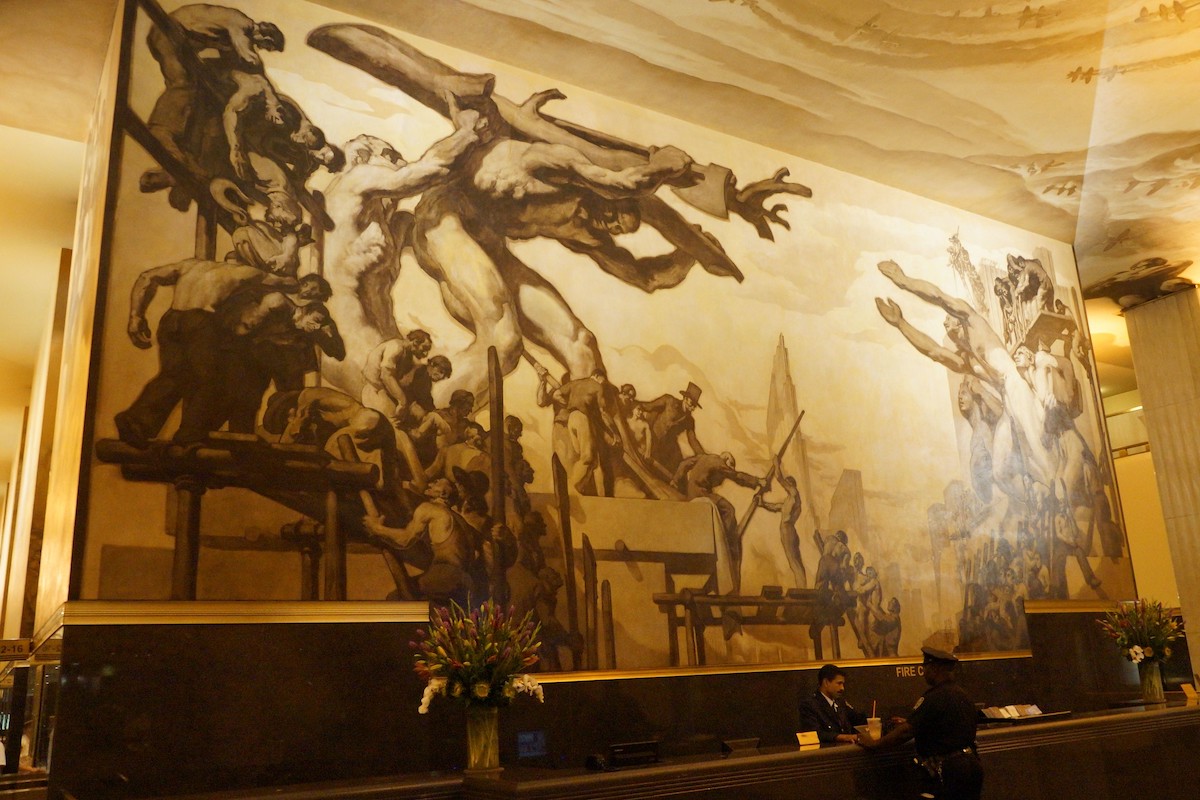 interior rockefeller building mural and reception